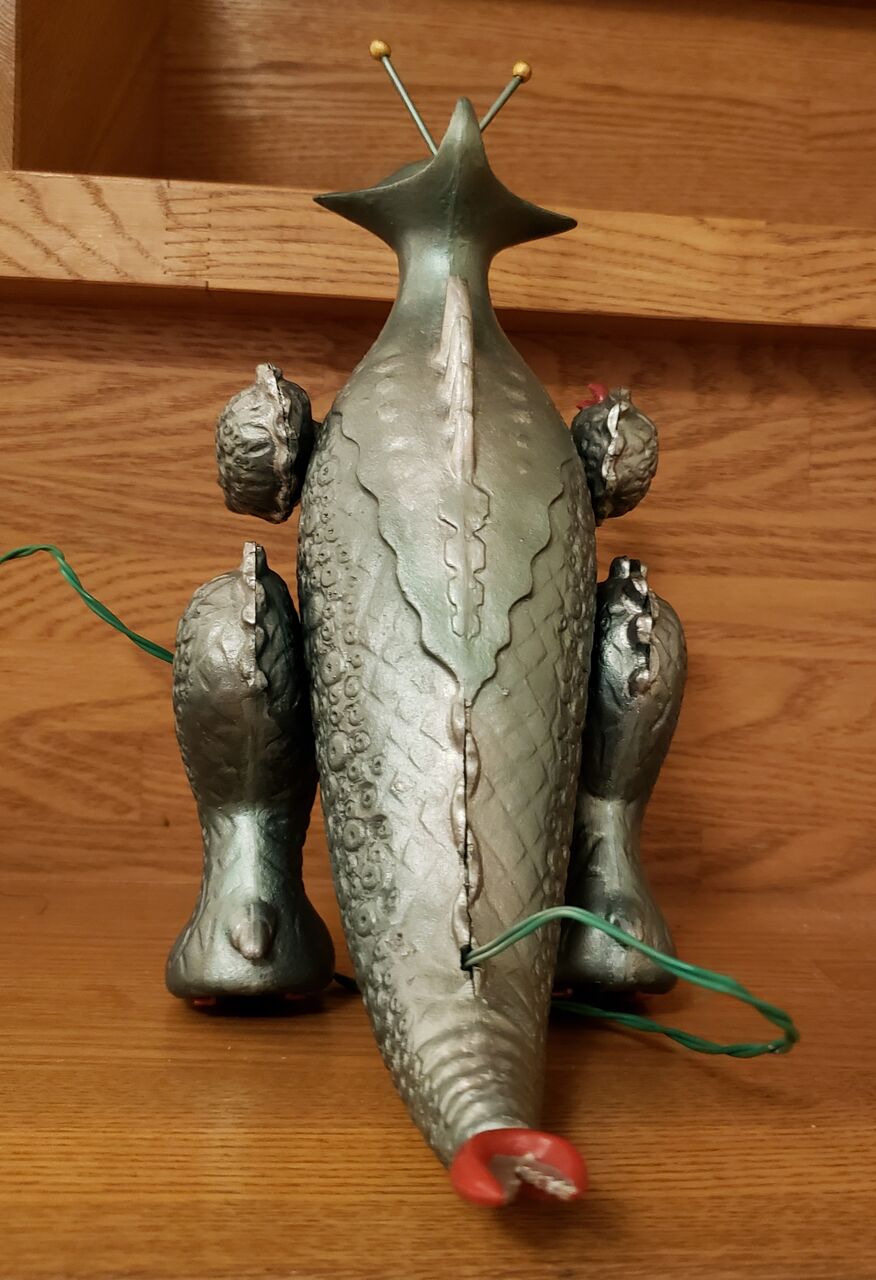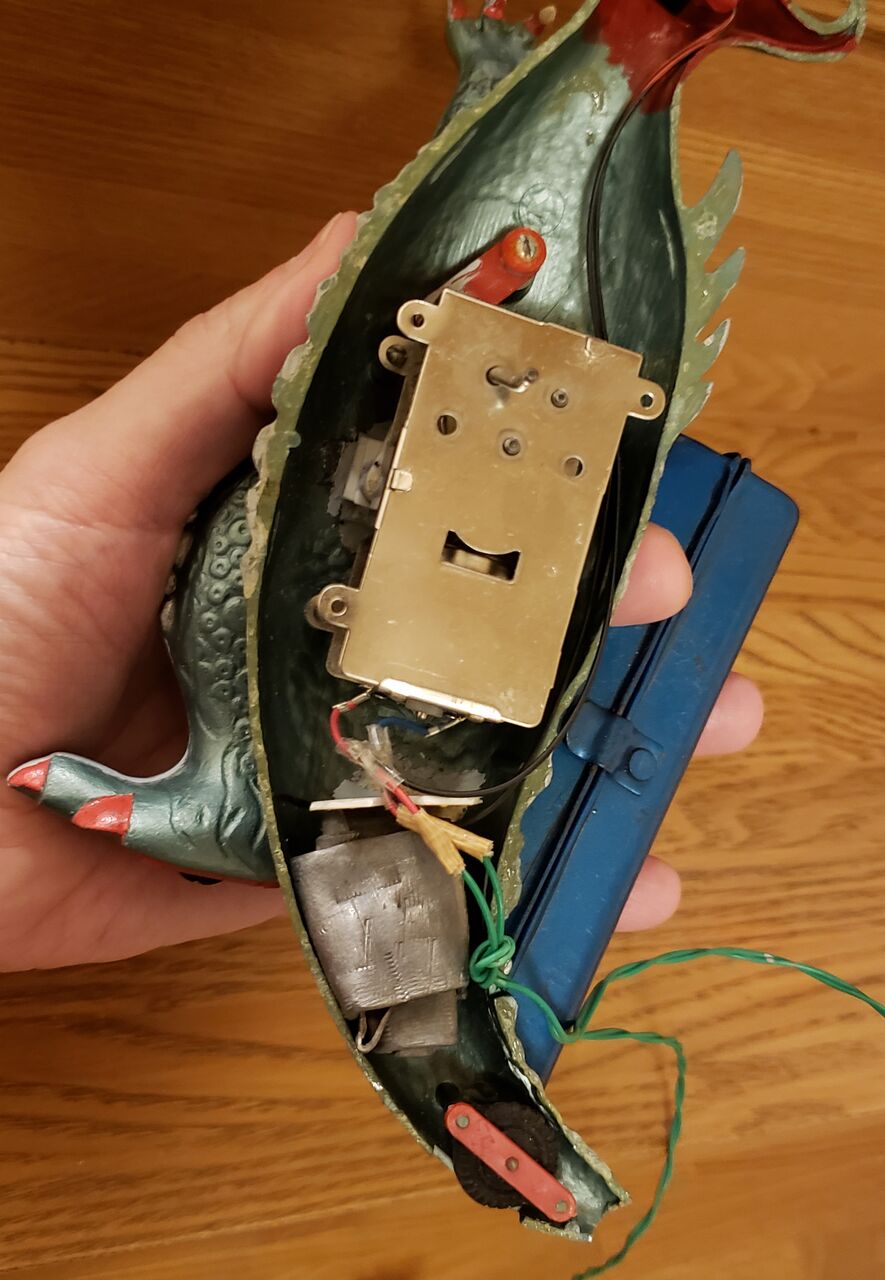 1967年製で、リモコンスイッチで口を光らせ声を上げて前進します。