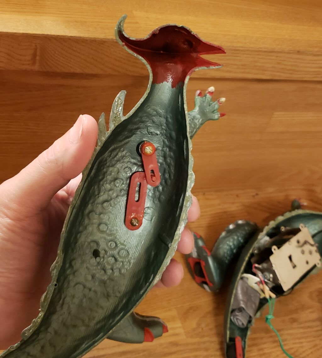 貴重な怪獣模型ですが、同時期のマルサン商店や日東科学の電動怪獣と比べると、かなり小振りで独特の作りです。