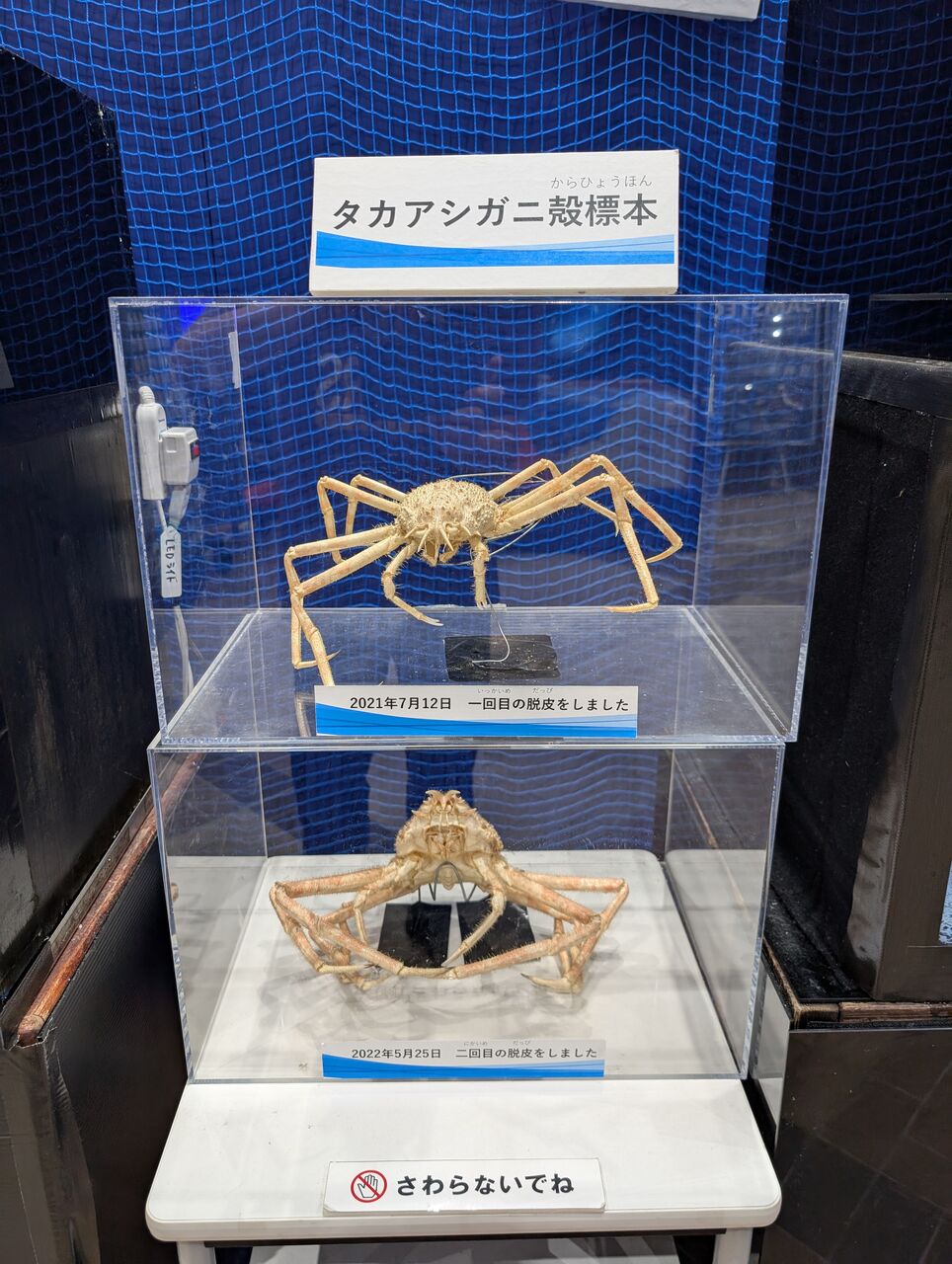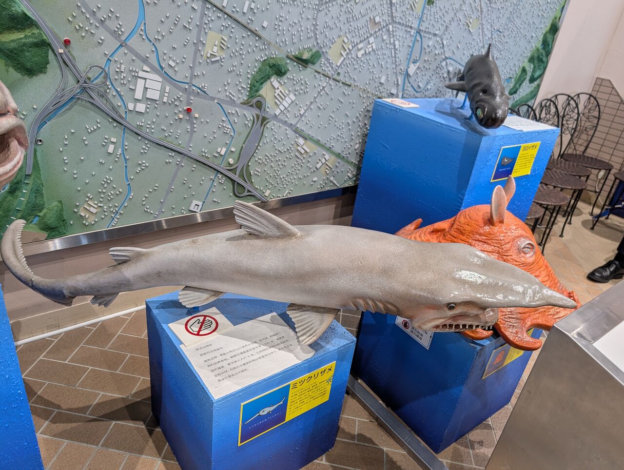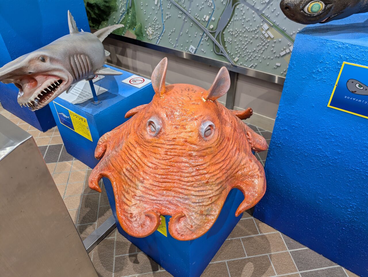 タカアシガニの標本に深海サメ等の魚類模型が並んでいました。